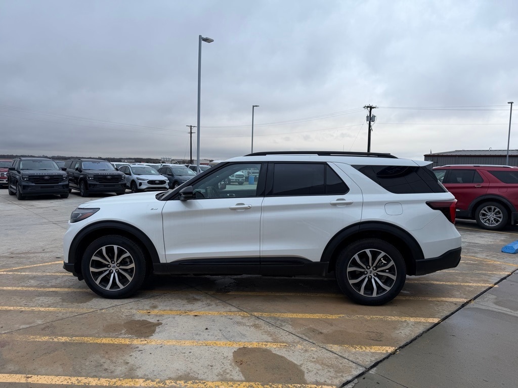 White Metallic 2025 Ford Explorer ST-Line 4WD 10-Speed Automatic 2.3L EcoBoost I-4 Equipment Group 300A Standard Package, Panoramic Vista Roof w/Power Shade.