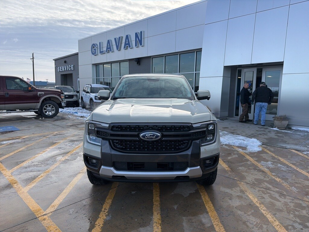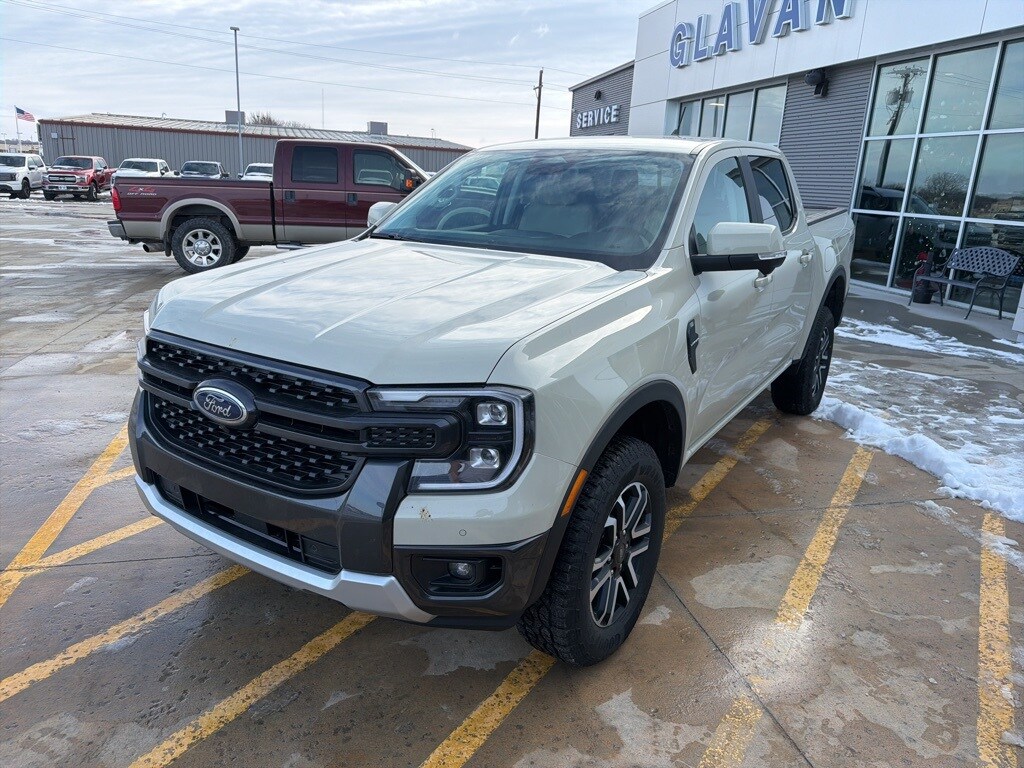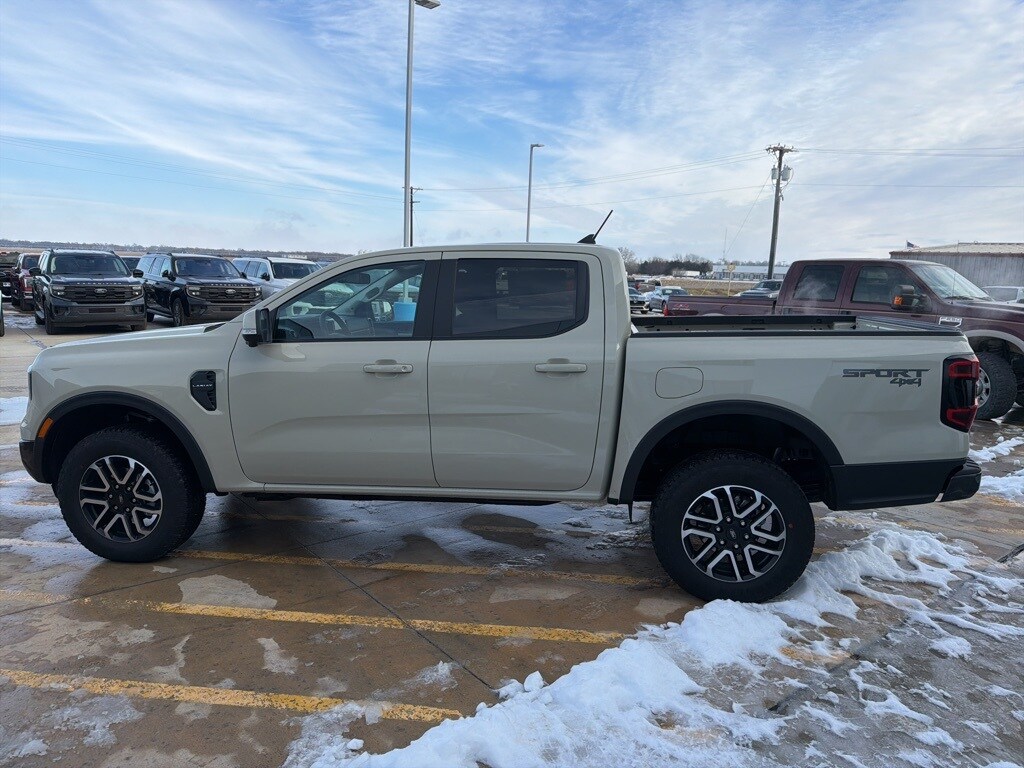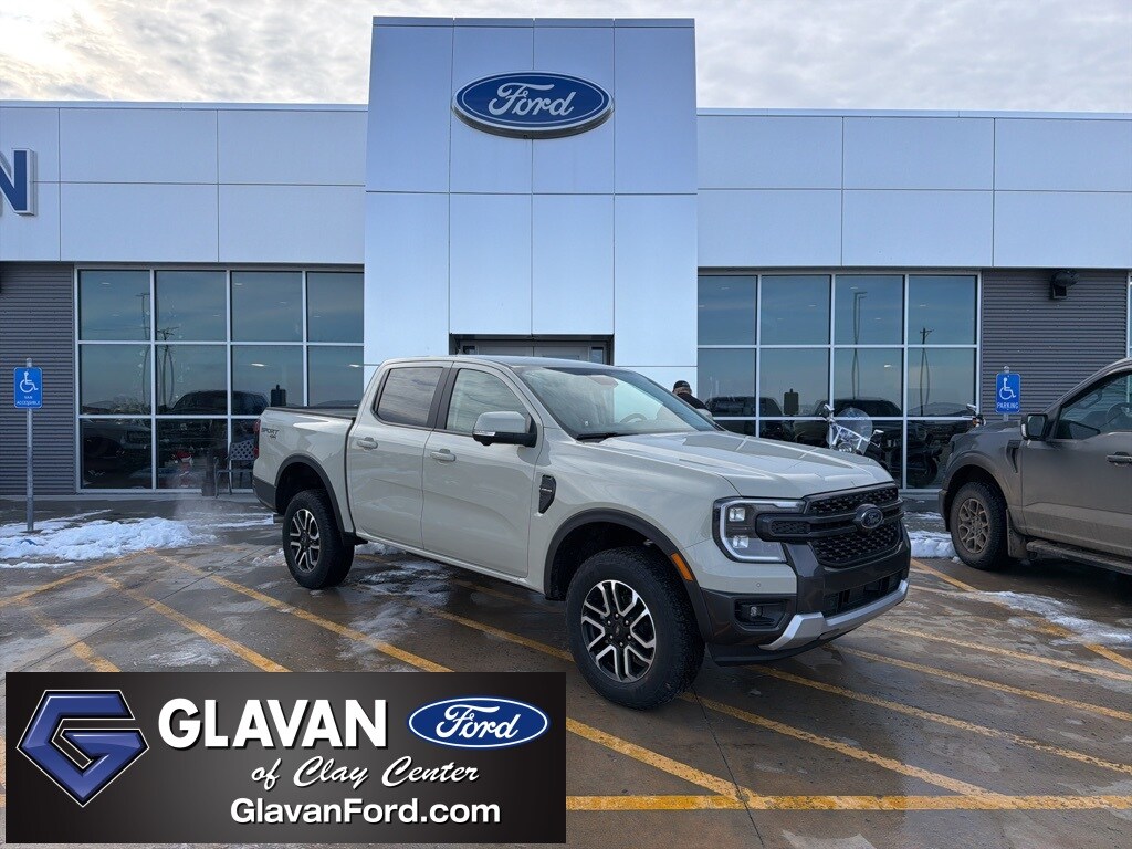 Beige 2025 Ford Ranger Lariat 4WD 10-Speed Automatic EcoBoost 2.3L I4 GTDi DOHC Turbocharged VCT Equipment Group 500A Standard, Gray Painted Center Bar & Grille Surround, Gray Painted Front Fascia & Rear Bumper, Navigation system: Connected Navigation, Sport Appearance Package, Sport Box Decal.