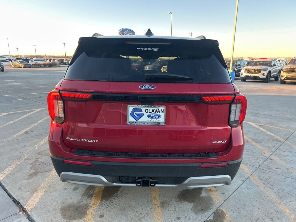 Rapid Red Metallic Tinted Clearcoat 2026 Ford Explorer Platinum 4WD 10-Speed Automatic 2.3L EcoBoost I-4 ActiveX Trimmed Captain's Chairs, Equipment Group 600A Standard Package, Lux Leather Package, Platinum Badges on Front Row Seats, Premium Leather Seating Surfaces Captain's Chairs, Quilting and Stitching on Door Panels, Quilting and Stitching on Seats, Radio: B&O Sound System by Bang & Olufsen with HD, Wheels: 20" Luster Nickel-Painted Aluminum.